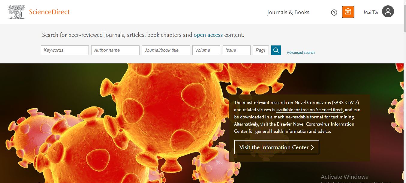 1. Trực tiếp: Tại các máy tính có kết nối internet ở Trung tâm Học liệu, bạn đọc có thể truy cập CSDL Science Direct trực tiếp qua địa chỉ https://www.sciencedirect.com/.